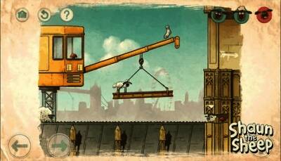 第1关:中羊推动小羊靠近木头,多次推动使木板横跨悬崖形成桥梁,三只羊依次过桥即可完成任务。
