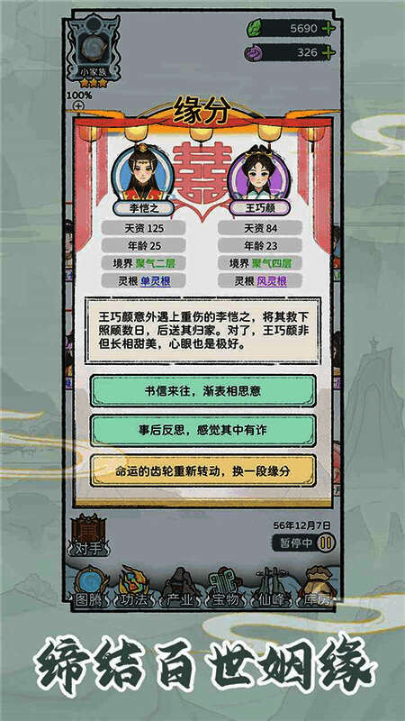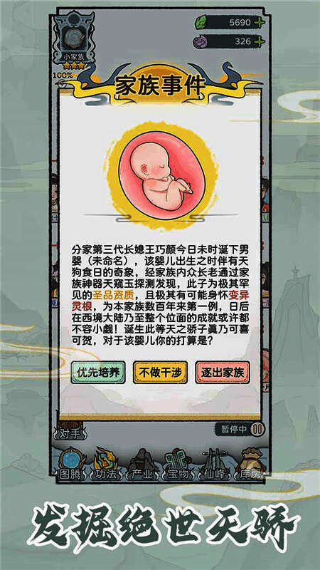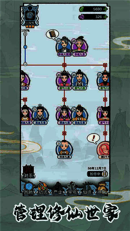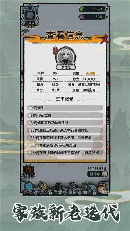 游戏的核心玩法围绕“家族血脉传承”展开,玩家需要为家族定制专属戒律与天赋体系,并通过世代培养影响后代资质。每个角色的出生都将继承父母部分属性,而这些数值将成为他们未来修炼道路的关键因素。同时,随着家族成员的成长,还会面临诸如天灾、秘境探索等随机事件,这些都将深刻影响整个家族的命运轨迹。