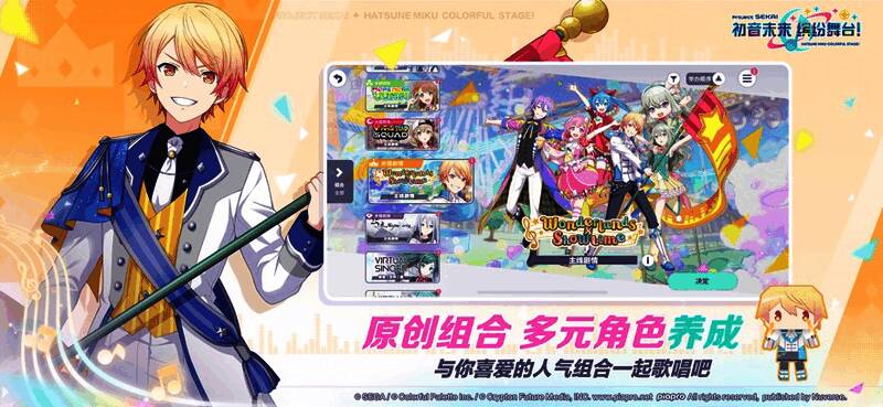 本作汇聚了众多虚拟歌手组合,包括经典系列的Virtual Singer(镜音连、镜音铃、MEIKO、初音未来、巡音流歌、KAITO)以及新世代的Leo Need(天马咲希、星乃一歌、日野森志步、望月穗波)、MoreMore Jump(日野森雫、花里实乃里、桐谷瑶、桃井爱莉)、Vivid Bad Squad(东云彰人、白石杏、小豆泽心羽、青柳冬弥)、Wonderlands Showtime(神代类、凤笑梦、天马司、草薙宁宁)以及25点,Nightcord见(晓山瑞希、东云绘名、宵绮奏、朝比奈真冬),每个角色都拥有独特的个性与专属曲目,丰富了游戏内容与体验。