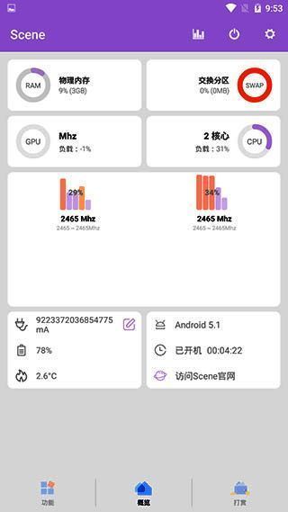 scene官方下载最新版8.0.3作为一款功能强大的手机系统优化工具,深受高阶用户的青睐。它不仅能够实时监测手机的核心运行状态,如内存使用、电池健康、处理器型号与频率等关键信息,还集成了性能调节、场景优化、手势操作与热点统计等多项实用功能,全面满足用户对设备精细化管理的需求,提升操作效率与使用体验。