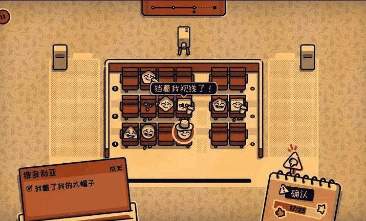 进入游戏后点击“开始游戏”即可选择关卡。每关通过点击底部角色并拖拽至座位完成布局,系统实时反馈满意度。当所有角色需求被满足,点击“确认”进入下一阶段。通关条件为收集全部“好评星星”,失败则会触发幽默尴尬动画,鼓励玩家重新思考布局策略。