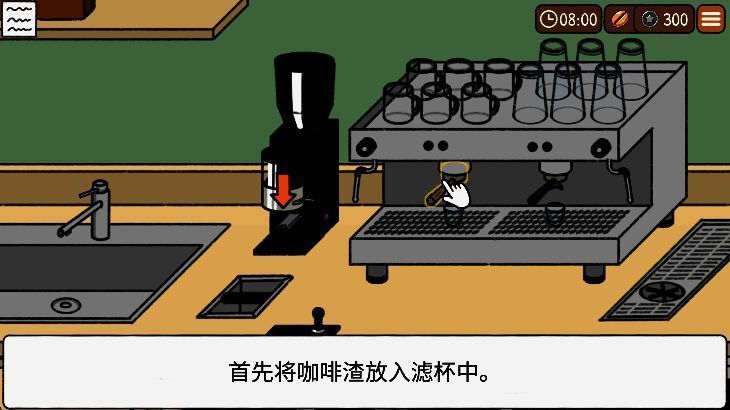 新手玩家从命名店铺开始营业,通过点击顾客头顶的对话气泡接单。随后依次完成取粉、压粉、萃取浓缩、添加配料、混合成品等步骤,最后将咖啡端上即可获得金币。每日结算后可前往商店补充原料库存,并逐步升级设备与装修空间,实现高效运营。