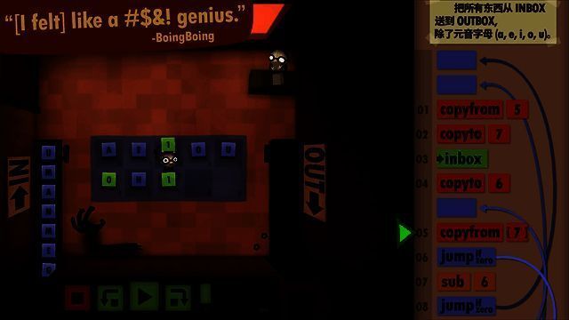 游戏判定机制独特:程序结束依赖于inbox指令读取空队列(null)触发跳出。若outbox位于inbox前且未合理控制输出节奏,易导致“输出过多”错误。此外,系统采用多序列验证机制,除当前输入外还会后台测试备用数据集,防止投机解法,保障算法普适性。