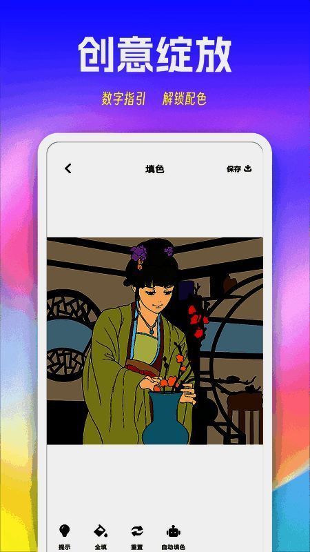 创意涂模式打破传统规则束缚,用户可自由选择任意画笔颜色与粗细,APP将自动填充选中区域,实现“一点即染”的顺滑体验。此模式特别适合喜欢个性化表达的用户,无论是为动漫角色换装,还是为古风美人添彩,都能随心所欲,尽情发挥想象力。