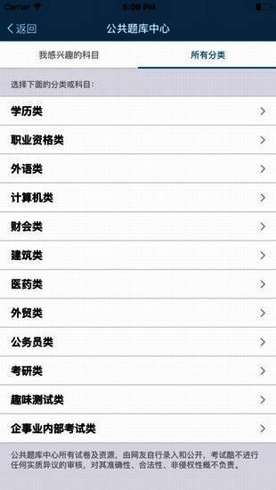在题库资源方面,《考试酷》涵盖了学历类、职业资格类、外语类、计算机类等多个大项,同时细化至财会、建筑、医药、公务员等具体方向。此外,还包括考研、外贸、趣味测试以及企事业内部考试等特色类别,几乎覆盖了当前所有主流考试领域,能够满足不同阶段、不同目标用户的备考需求。