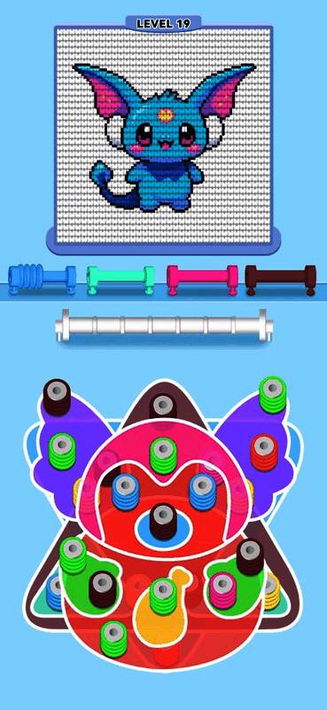 玩家需要睁大眼睛,仔细辨认目标颜色,并在由毛线球构成的拼图中找到匹配的颜色组合。收集三个相同颜色的羊毛球即可解锁新颜色,为你的创作画布增添更多色彩。游戏还引入了“第二空间”——暂存杆系统,帮助玩家临时收纳多余的毛线球,但要小心别让它超载哦!