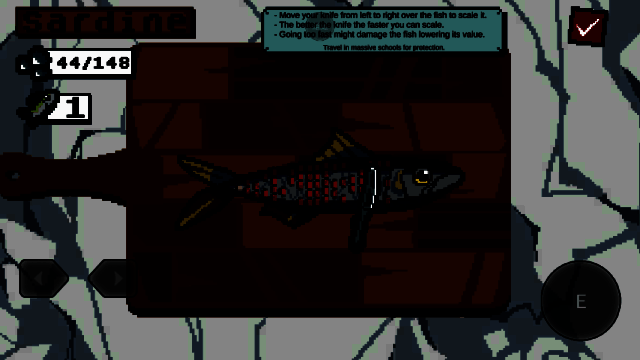 初次进入游戏后,点击右侧E键即可开始操作。通过左侧方向键控制角色移动至船舷边缘,再次按下E键即可开启钓鱼模式。精准操控鱼钩避开障碍物,锁定目标鱼种进行捕捞。成功钓起后,将鱼带回厨房案板处理,完成刮鳞步骤后,甚至可以投喂给神秘的海龟顾客——它吃完后会吐出金币,带来额外收益。
