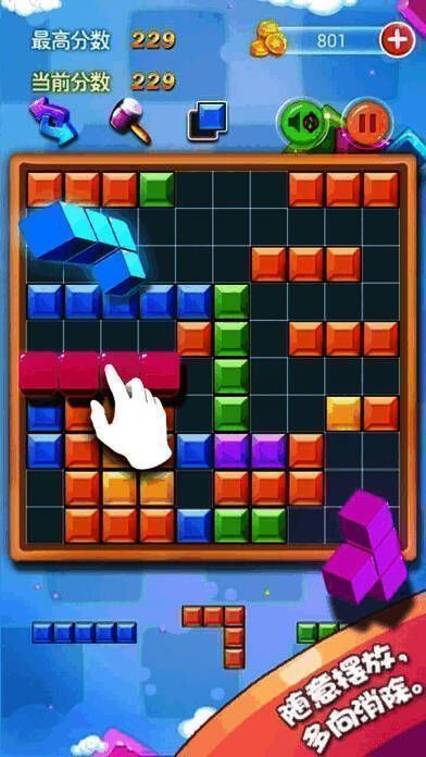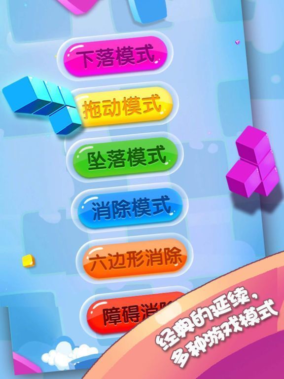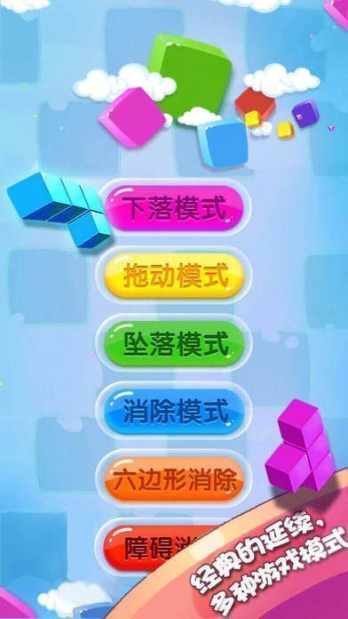 本作不仅完整收录了经典的下落消除模式,更推出了六大特色玩法,满足不同玩家的挑战需求。在“下落模式”中,玩家需灵活操控方块,完成多行消除以获取高分;“拖动模式”则考验策略布局能力,将三个备选方块合理填入宫格,直至无法放置为止;“坠落模式”引入颜色匹配机制,相同颜色方块堆叠三格以上即可消除,累计达26行则游戏结束。