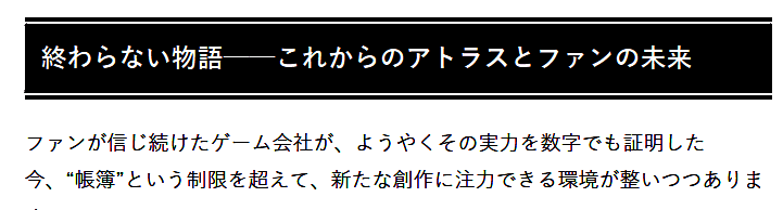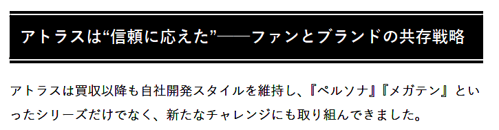·Altus社表示,自从合并后一直坚持开发固有的精品IP,包括《女神异闻录》以及《女神转生》,现在也在助力新IP,包括《暗喻幻想》等,需要注意的是,这些新IP并不是为了收益,而是与粉丝对话的成果。