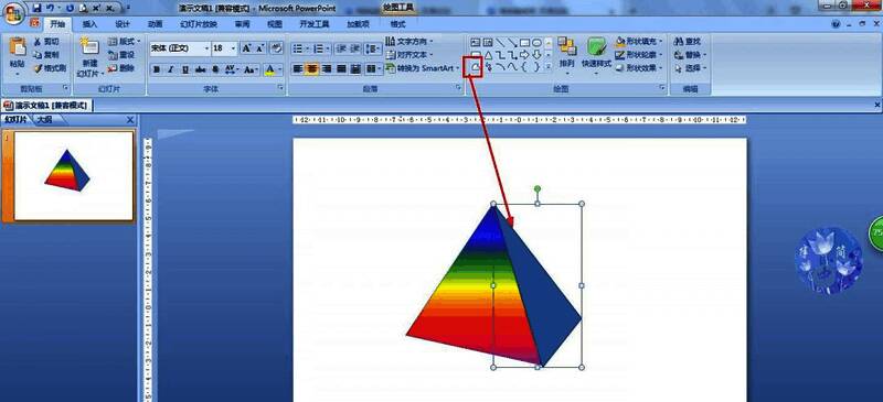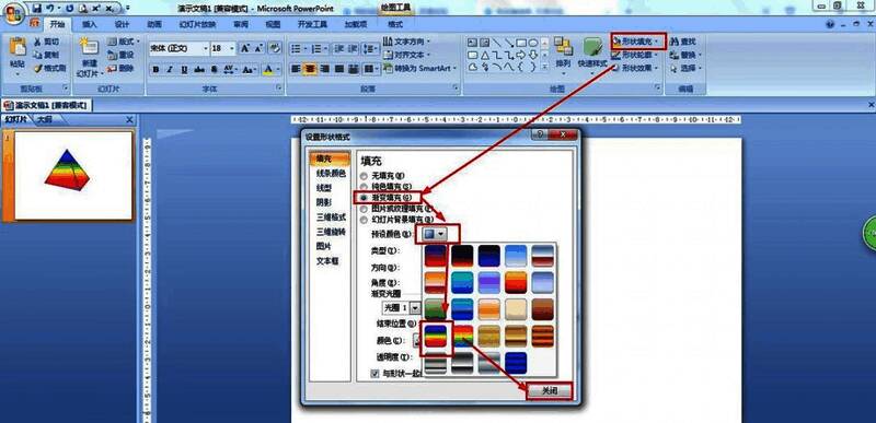 开始——形状填充——渐变——其他渐变——渐变填充——预设——选择彩虹——点击关闭。
