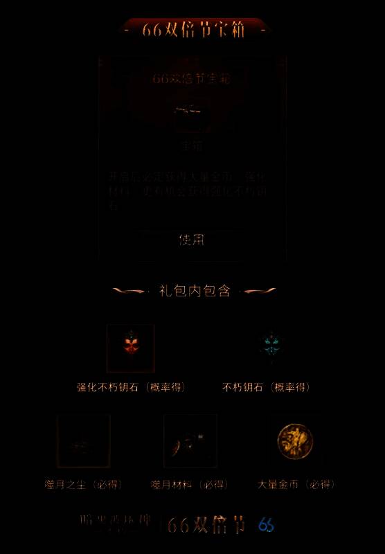 同时,只要在双倍权益持续期间击败怪物,就有机会获得66双倍节宝箱,开启即有概率收获不朽钥石、强化不朽钥石等珍稀物品!目前66双倍节宝箱已支持自动拾取,若拾取失败玩家还可前往邮件领取,以免错失奖励。