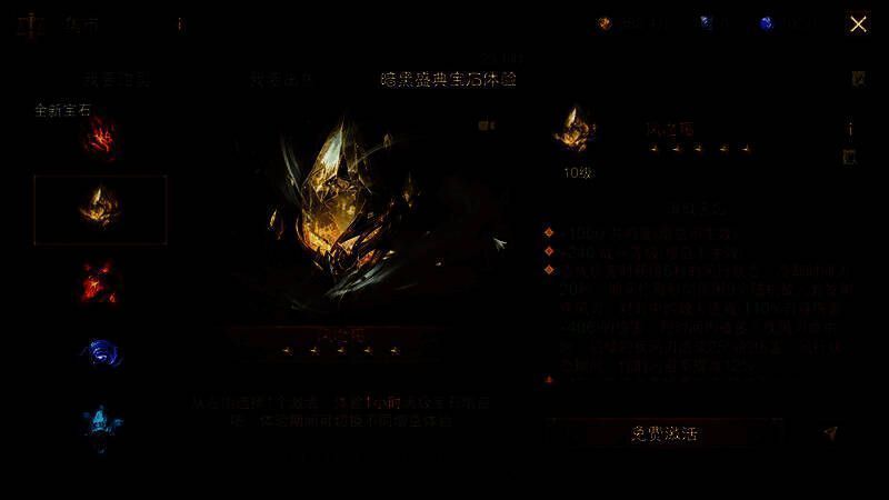 在“暗黑盛典”活动界面,领取满级五星宝石体验福利,并前往集市管理员处,即可自选一颗五星传奇宝石免费体验1小时,可选择的传奇宝石包括巨人之心、风之殇、咆哮之果、风暴之穹、狼之心。激活期间也可随时切换激活为其他宝石。