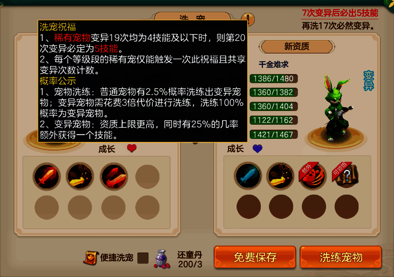 ③ 普通宠物有2.5%概率洗练出变异宠物;变异宠物需花费3倍代价进行洗练,且洗练100%概率为变异宠物。