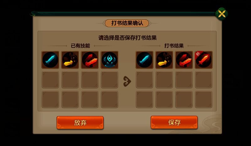 ④ 通过打书可以自定义增加或替换新技能,且可以手动保存或放弃。
