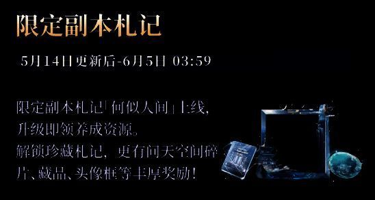 5月14日更新后-6月5日03:59,「何似人间」限定副本札记上线。完成任务提升札记等级,即可领取晶币、侧影养成道具、藏品养成道具、体力等奖励。