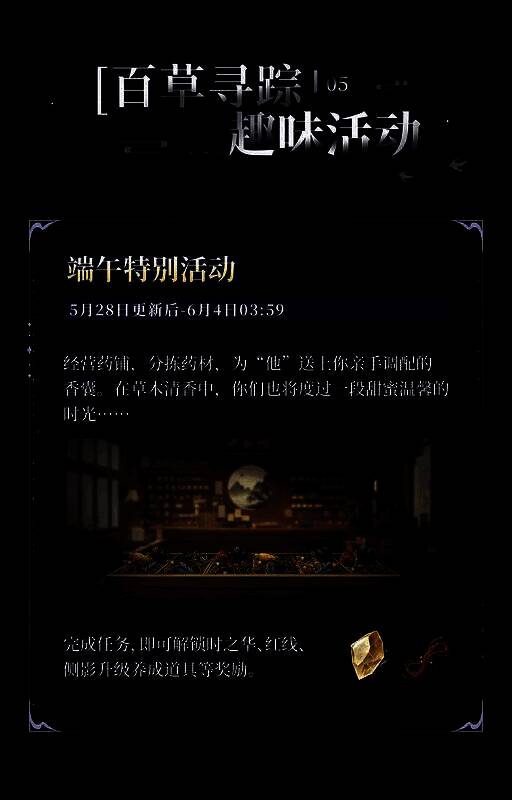5月28日更新后-6月4日03:59,特别活动「百草寻踪」限时开启。分拣百草,调配香囊,即可解锁时之华、红线、侧影升级养成道具、晶币等奖励。
