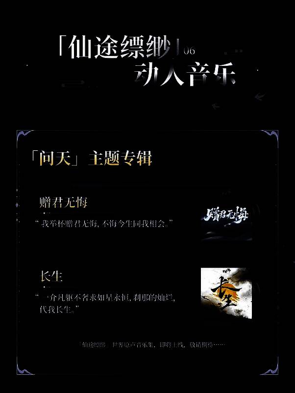 ⌈问天⌋ 主题专辑已上架,全新主题歌《赠君无悔》、《长生》均可前往网易云平台收听:https://music.163.com/#/album?id=271626327。