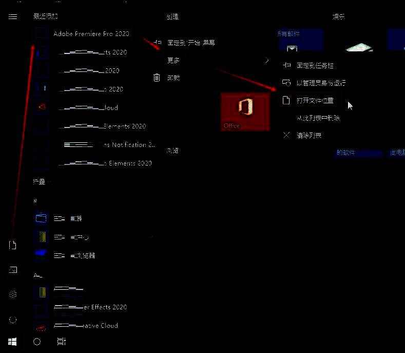 点击电脑左下方的开始,在最近添加里面找到Adobe Premiere Pro 2020软件图标,用鼠标右键单击,更多里面,点击打开文件位置;