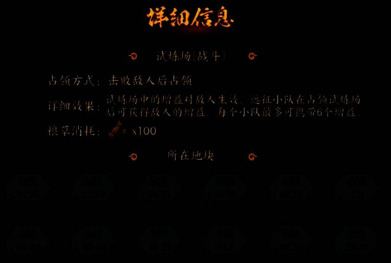 1、在探索的过程中,会出现“试炼场”地块,占领此类地块后,可以获得不同类型的增益,每个小队最多可携带6个增益;