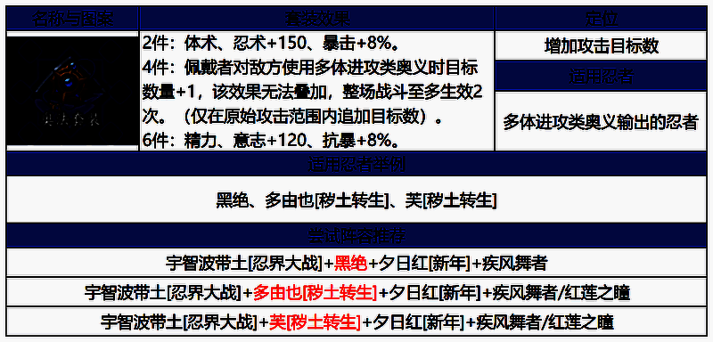 (2)手鞠[疾风传]造成暴击伤害时会附带目盲,反复刷脸触发暴击,目盲敌方无法免疫不良状态的输出忍者。