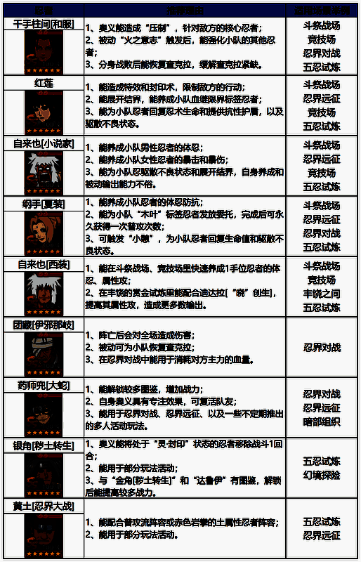 a、以上远征忍者的推荐理由仅供参考,不分先后,需要根据不同的环境和自己所拥有的忍者进行合理选择搭配;