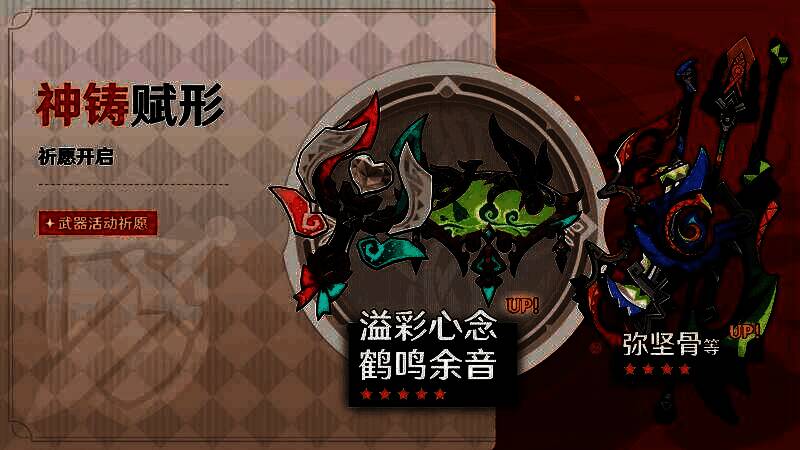除此之外,「神铸赋形」活动祈愿也已开启,全新限定五星武器「法器·溢彩心念」、限定五星武器「法器·鹤鸣余音」迎来概率UP!