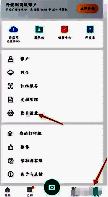 1、首先打开扫描全能王APP,主页面右下角【我的】专区选择【更多设置】;