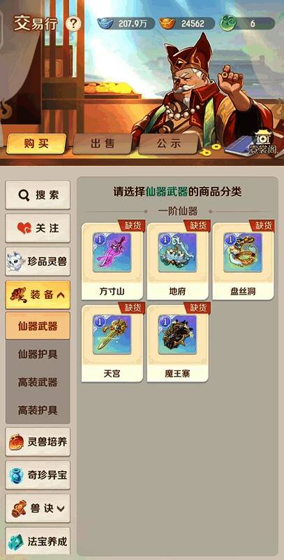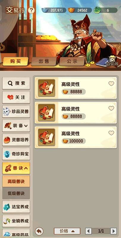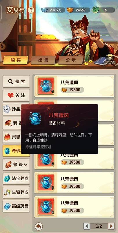 目前,交易行能买到的物品种类繁多,例如各类兽决、灵兽培养材料、法宝培养材料等,每一类物品都能通过对应的标签快速寻找,当然玩家们也能使用游戏的搜索功能,通过关键字快速找到自己所需的商品。