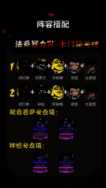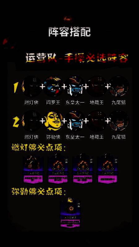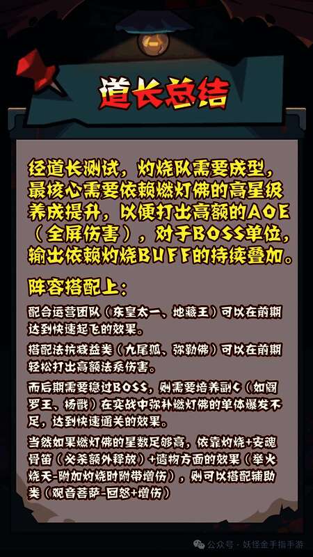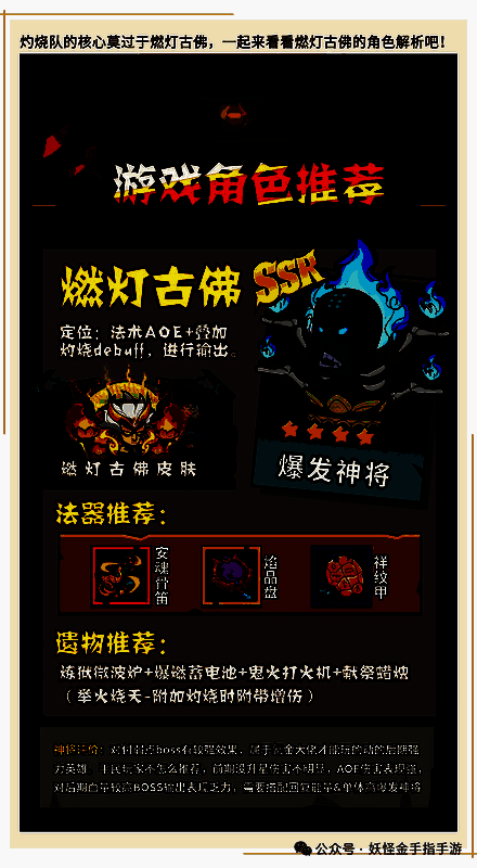 妖怪金手指灼烧队阵容搭配攻略来了!灼烧队需要成型,最核心需要依赖燃灯佛的高星级养成提升,以便打出高额的AOE(全屏伤害),对于BOSS单位,输出依赖灼烧BUFF的持续叠加。灼烧流阵容的核心莫过于燃灯古佛,对付弱点boss有较强效果,属于金大佬才能玩的动的后期强力英雄。平民玩家不怎么推荐,前期没升星伤害不明显,AOE伤害表现强:对后期血量较高BOSS输出表现乏力,需要搭配回复能量&单体高爆发神将!