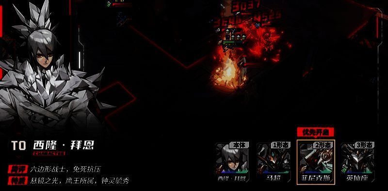 2 形态菲尼克斯,擅长生存和绕后群攻。和他的名字一样的自带免死回血被动,1技能叠满天赋后不消耗能量,飞行移动配合长射程的2技能,最远能清理9格远的杂兵,开荒体验十分良好。
