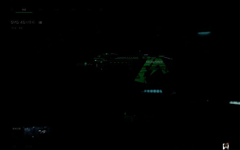 外观方面:这把改装版SMG-45冲锋枪以黑色为主体基调,搭配鲜明的亮绿色装饰,整体呈现出强烈的视觉冲击感。枪身侧面印有“DELTA FORCE”字样及闪电图案,凸显凌厉风格。