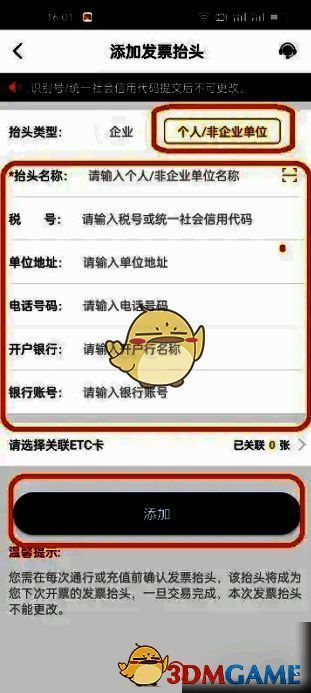 3、切换到添加发票抬头页面以后,首先点击【个人/非企业单位】,然后填写发票抬头信息,最后点击【添加】即可。