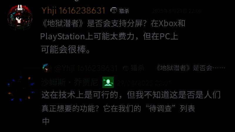 近日有玩家在游戏官方社区询问《绝地潜兵2》是否会支持分屏游戏功能。Arrowhead工作室CEO回应称,合作分屏模式“在技术上是可行的”,但不确定这是否是玩家真正想要的功能。不过该功能已被列入“待调研”清单,这意味着未来可能会有进展,但玩家不宜过度期待。