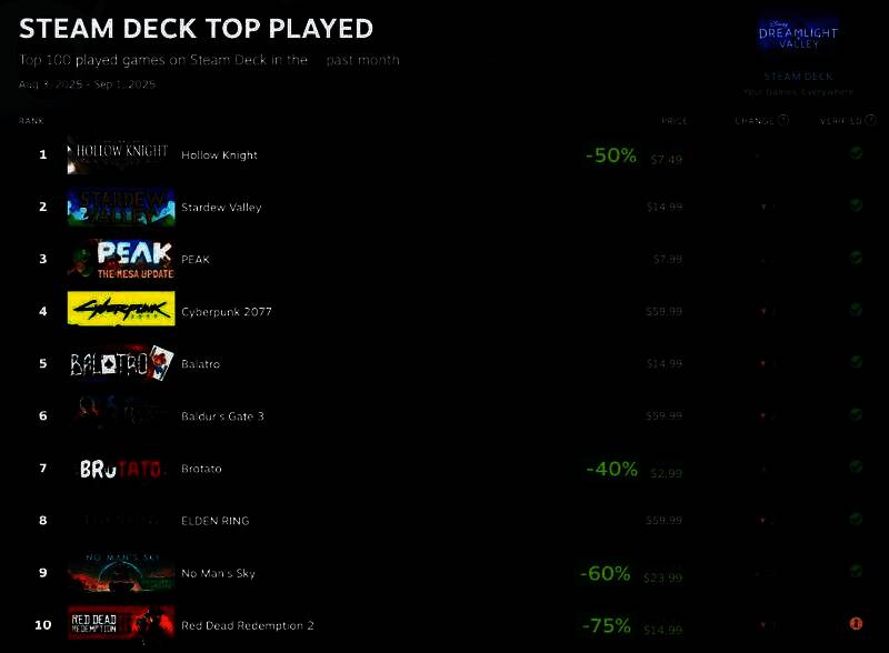 Valve官方确认,《空洞骑士》成为八月Steam Deck平台游玩次数最多的游戏。这款独立佳作在发售数年后依然保持强劲吸引力,随着其备受期待的续作即将问世,游戏人气再度飙升。