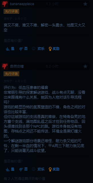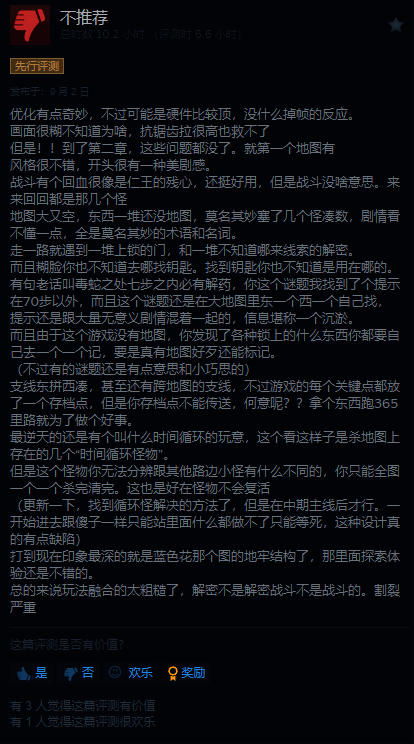 给出评价的玩家表示,游戏的优化出奇的不错,差评主要集中在战斗无聊,爽又不爽,难又不难,支线隐晦难做,各种元素像僵硬拼凑在一起。
