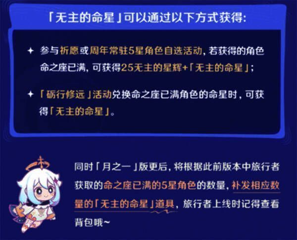 当玩家通过祈愿或周年常驻五星自选活动获得的角色已满命时,会自动获得25无主的星辉+1枚无主的命星。