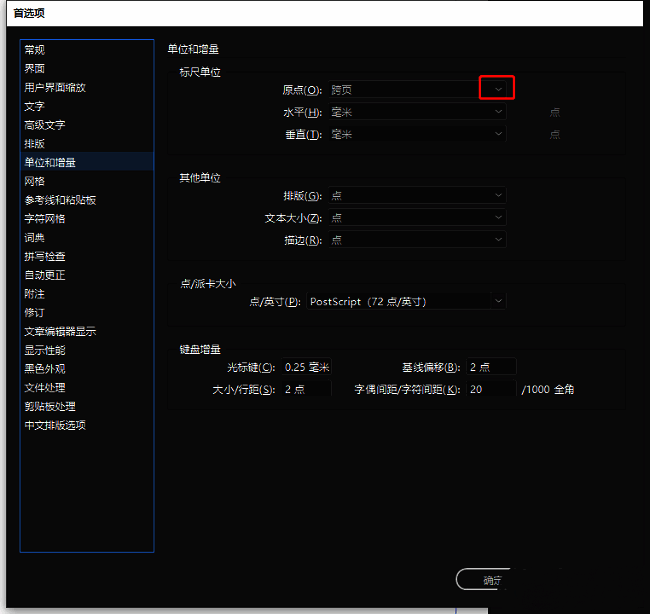 3、然后在打开的窗口界面中,点击右侧"标尺单位"一栏中的"原点"选项框的下拉按钮。