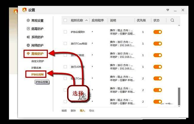 3、在打开的窗口界面中,点击左侧栏"高级防护"中的"IP协议控制"选项。