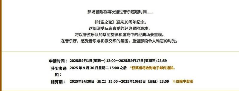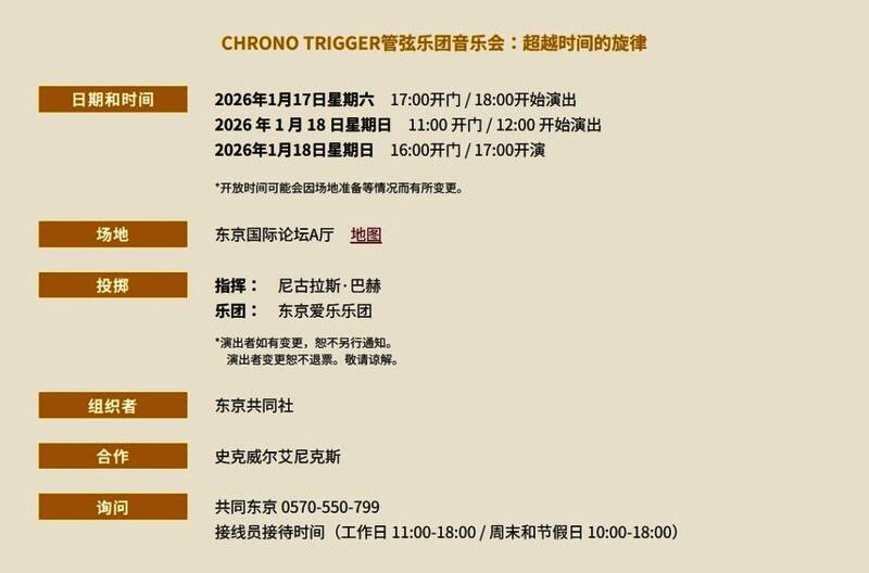 史克威尔艾尼克斯公司(SE)宣布,为庆祝《超时空之轮》发行30周年,将于2026年1月在东京举办大型管弦音乐会。这场名为"穿越时空的旋律"的音乐会将于2026年1月17日至18日在东京国际论坛A厅举行。