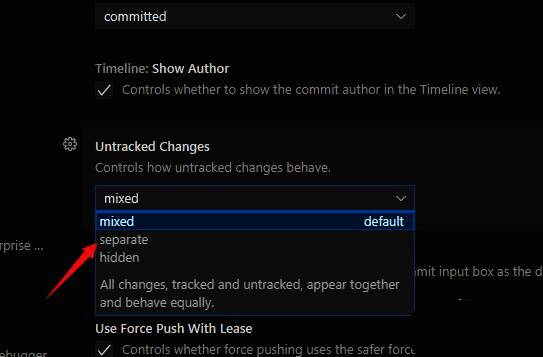 4、然后找到右侧中的"untracked changes",最后点击选项框的下拉按钮,在下方给出的选项列表中选择"separate"就可以了。