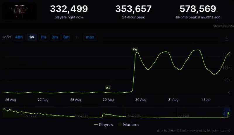 自2024年12月以抢先体验模式发布以来,《流放之路2》就获得了极高人气。发行初期,这款动作RPG在Steam的同时在线玩家数峰值达到578,569人,此后虽逐步下滑,但上周末再次迎来数据暴涨。