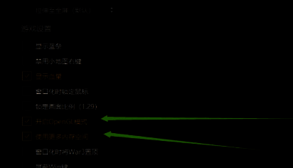 2、然后在打开的窗口界面中,找到"游戏设置"一栏,并将其中的"开启openGL模式"以及"使用更多内存空"小方框勾选上。