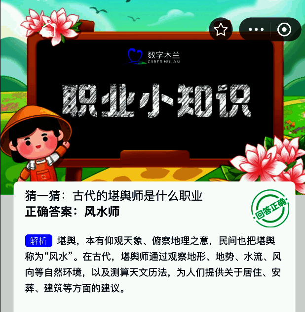 猜一猜:古代的堪舆师是什么职业?这是2025年9月6日支付宝蚂蚁新村的每日题目,每天坚持来蚂蚁新村答题,就能提升你的木兰币生产速度,助力小镇蓬勃发展。答对问题的话,可获得“产速+3/时”的加速奖励哦!今天正确答案是【风水师】。古代的堪舆师,其实就是我们如今常说的“风水师”。他们是一类专门从事风水堪舆活动的专业人士,其工作内容涉及相地、测位、择吉等多方面,兼具环境观察与传统文化象征意义。