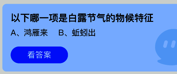 以下哪一项是白露节气的物候特征?这是9月7日蚂蚁庄园的小鸡课堂题目哦,支付宝里这个小鸡答题超受欢迎的!只要攒够饲料喂小鸡,就能收获更多鸡蛋,一起为公益助力啦!今日正确答案是【鸿雁来】,鸿雁南飞,元鸟北归,群鸟储食,此乃白露节气特有的物候景象。随着气温逐渐下降,天气转凉,温度变化成为主导物候现象的关键因素。为应对寒冷、适应环境变迁,鸟类纷纷采取相应行为,或迁徙以避寒,或储备食物以度凉季,展现出与自然节律相协调的生命智慧。