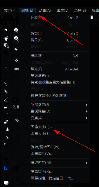 1、双击打开软件,点击上方菜单栏中的"编辑",接着点击下方选项列表中的"图像大小"。