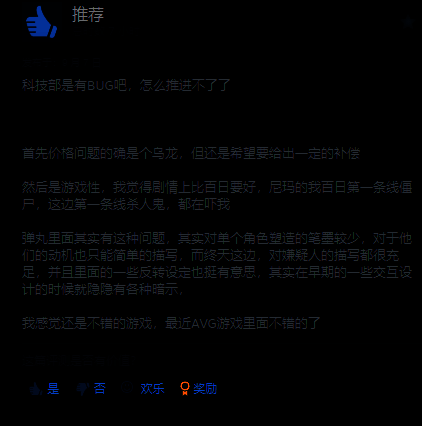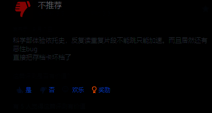 截至目前,给差评的玩家表示,科学部体验反复读重复片段不能跳只能加速,并且还有恶性bug直接把存档卡坏档。