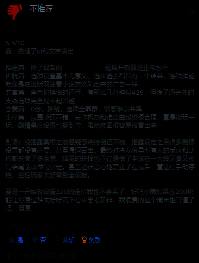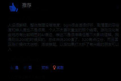 也有玩家表示,人设很鲜明,整体推理没什么难度,汉化有明显AI痕迹,表达不是很准确但是不太影响理解。玩家认为320还是不太值,建议观望的玩家等打折入手。