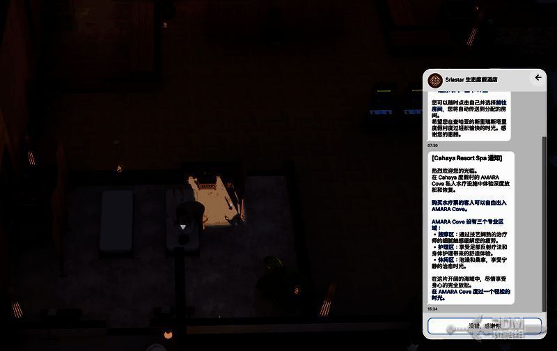 在度假村中想要体验水疗,首先需要获得水疗资格。直接点击水疗床会发现选项都是灰色,此时需先成为“水疗客人”。玩家可在房间前的自助服务机花费300购买一张水疗券,购买后系统会发来确认短信。完成后即可正式使用水疗床等设施,享受完整的度假村水疗服务。