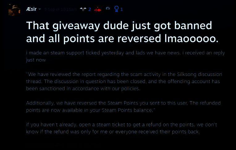 根据aesir的说法,部分玩家收到了来自Steam的邮件通知,确认点数已退回。但也有玩家称并未获得补偿,相关退款处理情况仍存在争议。