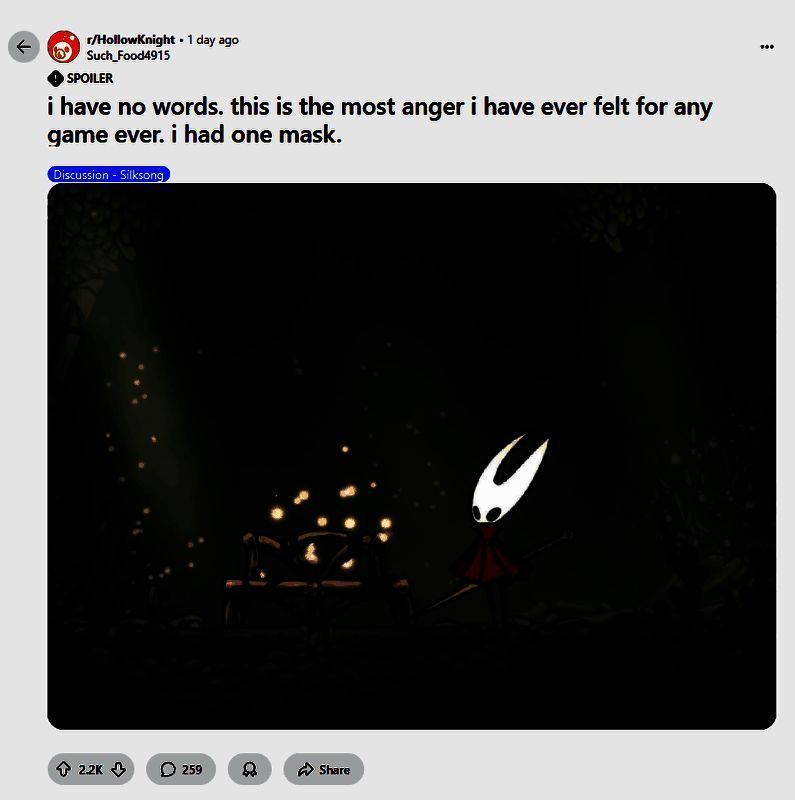 这一事件引发社区热烈讨论。不少玩家认为这是开发商Team Cherry对系列既有规则的一种大胆突破,也有人批评其破坏了玩家对“长椅”机制的信任。无论如何,该设计已成为《丝之歌》发售后玩家们最具争议和话题性的发现之一。